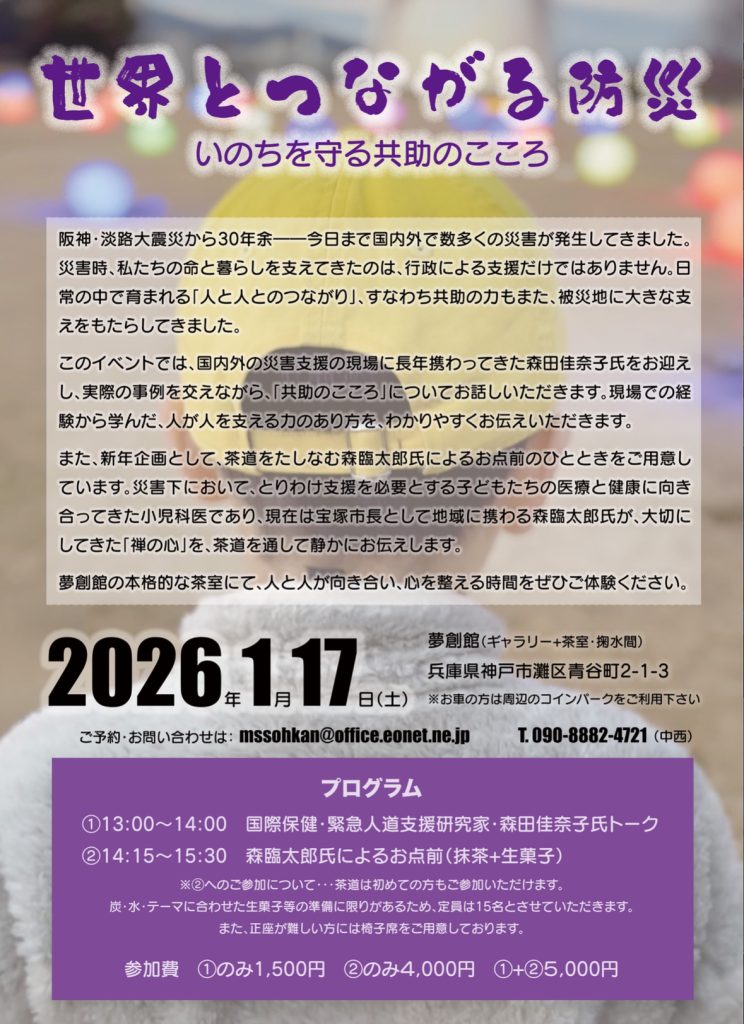 宝塚市長で小児科医の森臨太郎氏によるお点前を通じて、「共助のこころ」と静かに向き合う時間を持ちます。